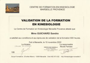 J’ai réalisé ma formation au sein de Surya Formation à Marseille, qui est reconnue par la Fédération Française de kinésiologie et au sein de laquelle tous les intervenants ont une certification internationale.